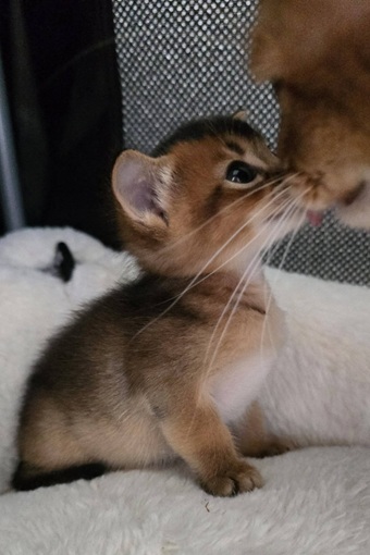 Am 24.11.2025 ist der G-Wurf zur Welt gekommen. Um 16:52 Uhr erblickte ein kleines Katzenmädchen in ruddy (wildfarben) das Licht der Welt. Die Eltern des kleinen sind unsere Somalidame Ferox Felinus Victoria und unser Abessinierkater Borka vom kuschligen Leoparden. Das kleine Mädchen wird den Namen Gisele von Solongo tragen.